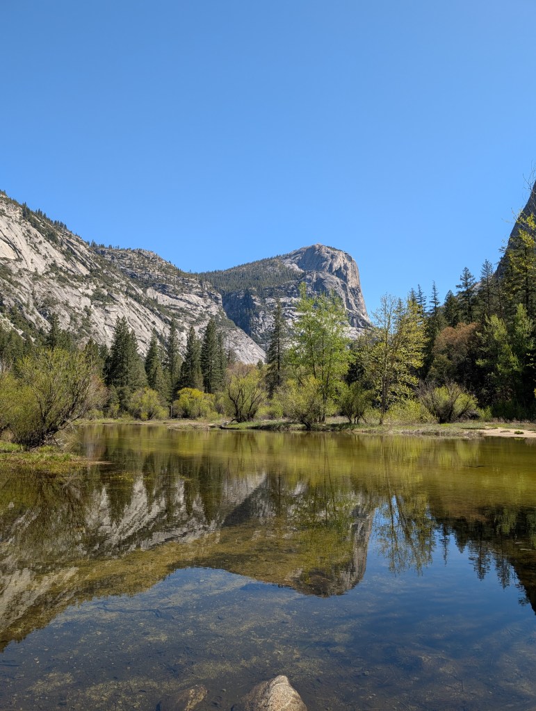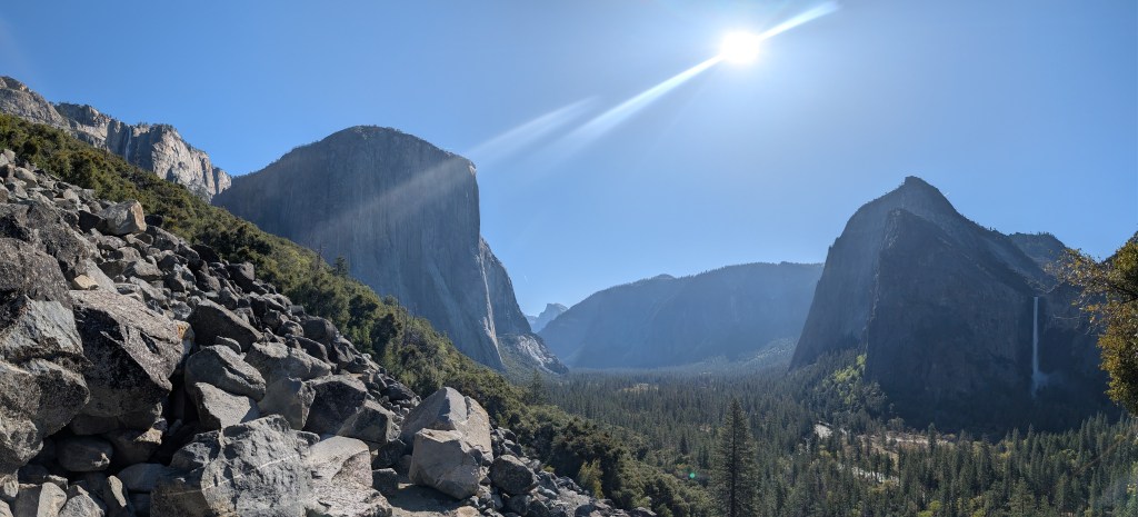 My first hike in the park, and possibly the biggest bang for our buck was OBOFRT, or Old Big Oak Flat Road Trail. This short hike led to incredible views of almost the entire valley! And since this trail is an abandoned road, not a maintained trail, it was virtually empty. Because of the lack of trail maintenance, there were several logs to traverse and even a steady creek to cross, making it a great mini adventure. In my attempt to cross the creek, I fell in thigh deep, leaving my feet soaked for the rest of the hike. But I was in such high spirits, not even soggy socks could get me down! The panoramic shot I got on my phone obviously doesn’t do this view justice. But this short hike to this stunning view of the valley was amazing!