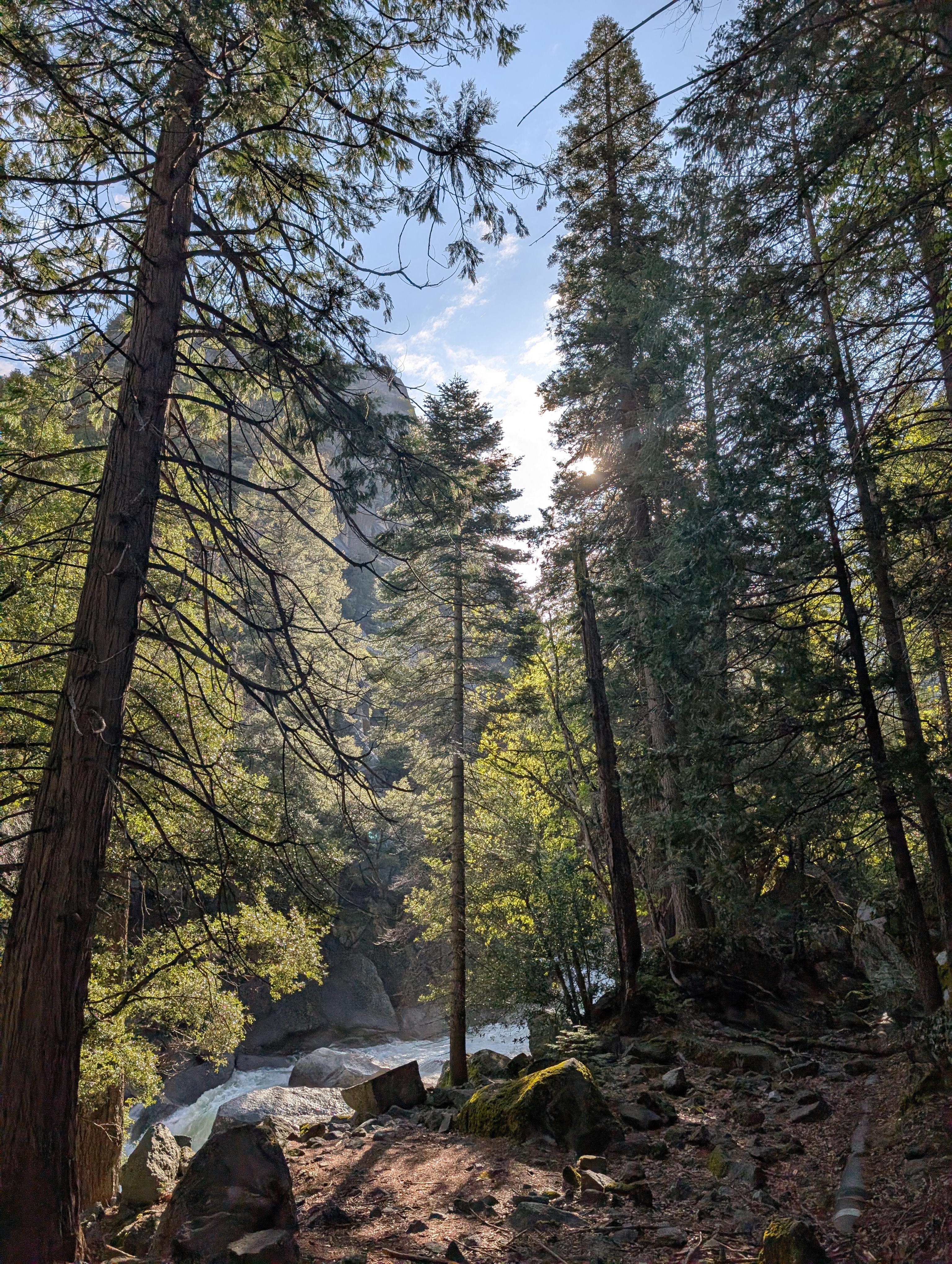 OBOFRT wasn’t the only amazing hike I went on while in Yosemite. Keaton, friends and I also hiked the Mist Trail, which is known for the magical rainbows that fill the air on a sunny day. Unfortunately, there was some cloud cover while we hiked this trail, so we didn’t get any rainbows. But, we did get plenty of mist and TONS of amazing views! It seemed like every turn led to something else that left me in complete awe. From above, dense forest canopy painted the valley a hundred shades of greens. The igneous rocks told a story of the landscape, but still leave a hint of mystery. Geologists aren’t sure what caused these stark peaks to uplift after the lava cooled underground, leaving us to question how and why the majesty of these rocks are here. The winding Mist Trail up to Vernal Falls leaves you soaked, which was welcomed on a hot day.